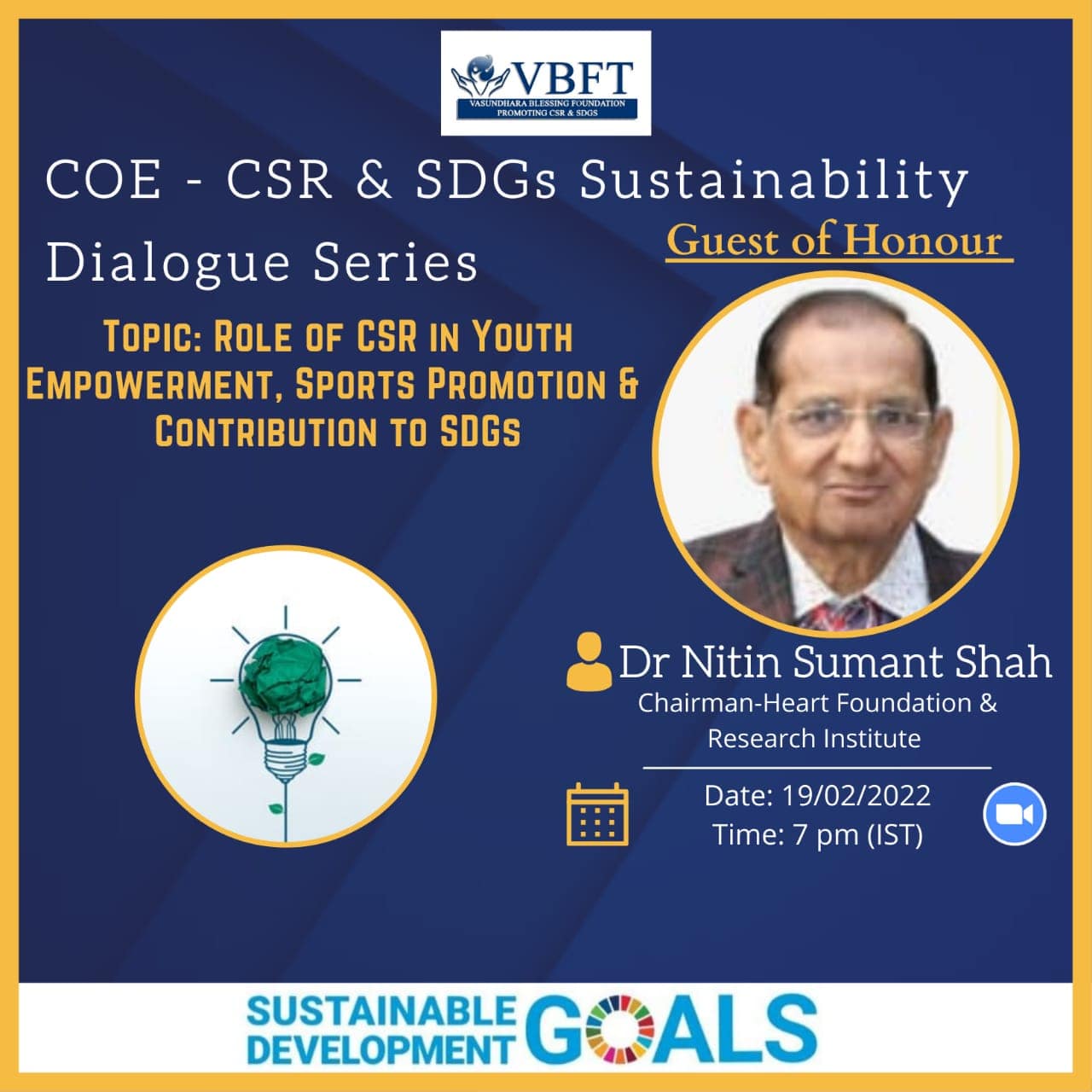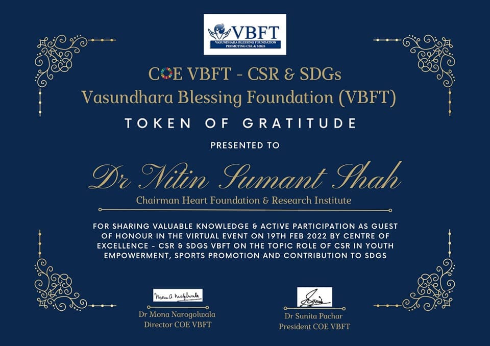 Dr. Nitin Sumant Shah, Chairman of Heart Foundation and Research Institute was invited as the Guest of Honour for COE – CSR & SGDs Dialogues & Partnership Series on 19th February 22. The Topic for the session was Role of CSR in Youth Empowerment, Sports Promotion & Contribution to SDGs. During the session the Head of SBI foundation gave a brief of various activities carried out under youth development and sports. Later Dr. Nitin Sumant Shah shared various sports initiatives and Youth initiatives carried out under HFRI. He also motivated the participants to promote sports for good health and wellbeing. In the end he wish good luck and good health to everyone.